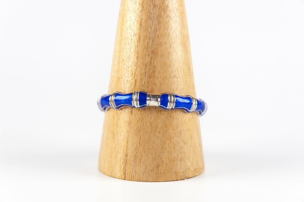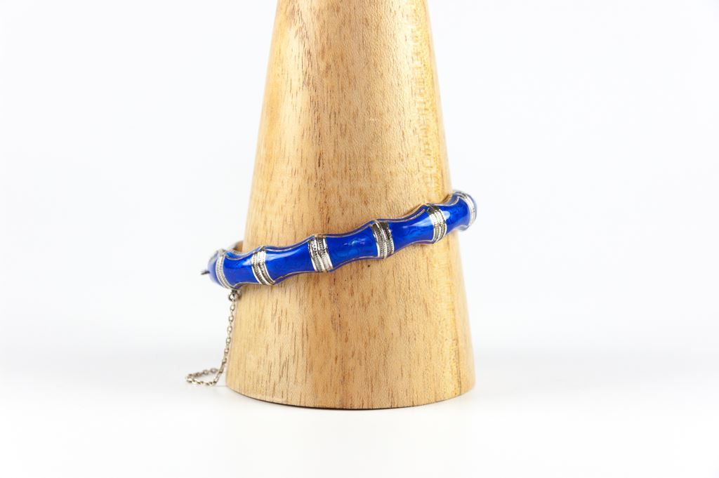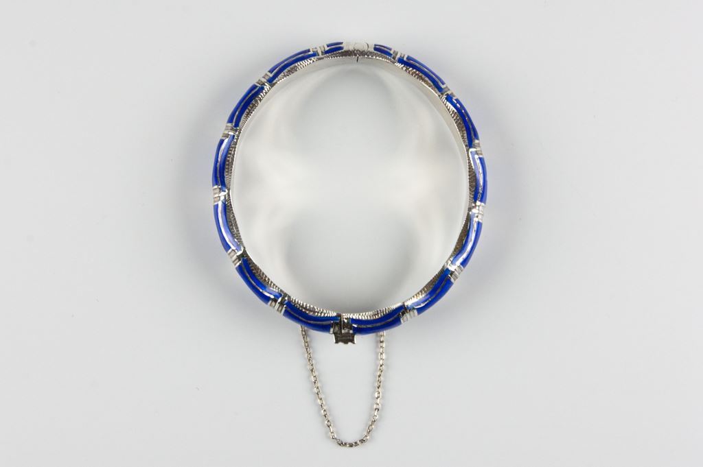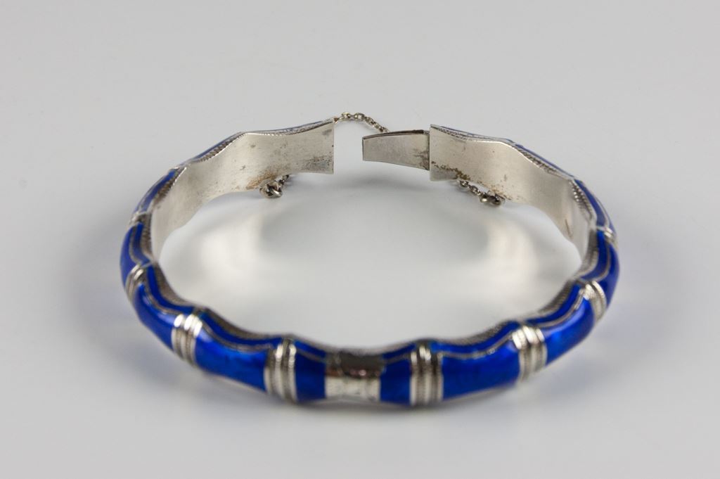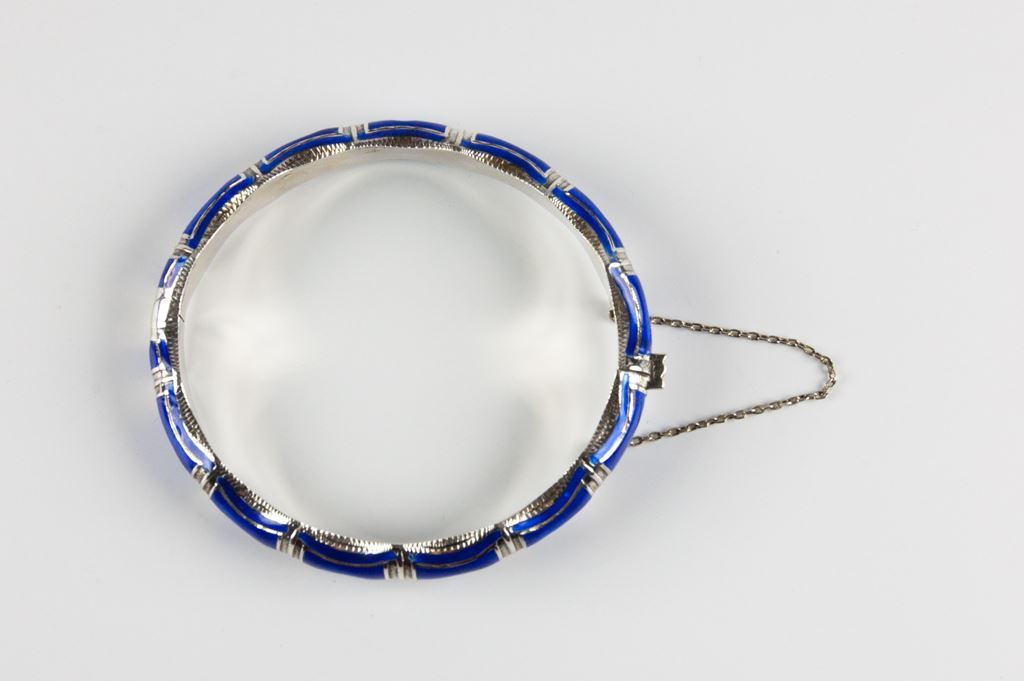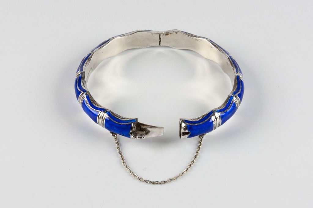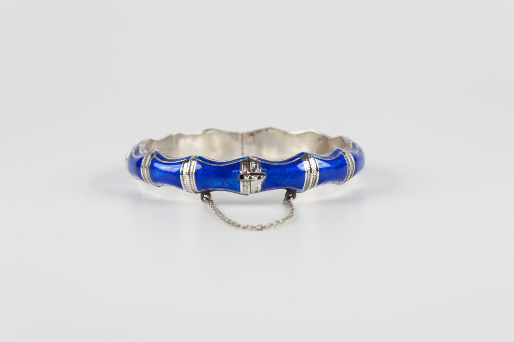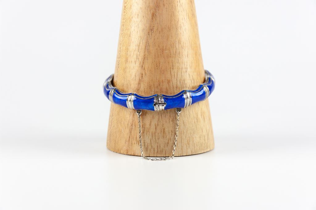 This is a beautiful hinged bangle, segmented by basse taille panels of blue enamel over an engraved base.