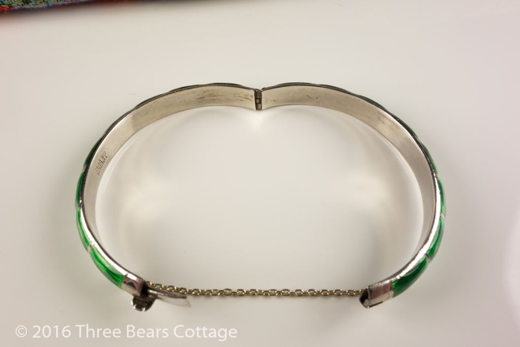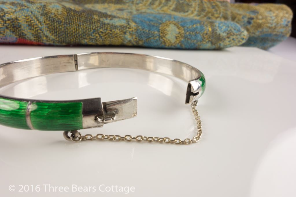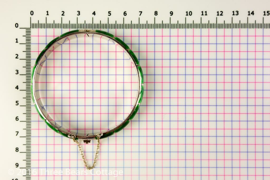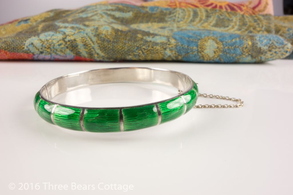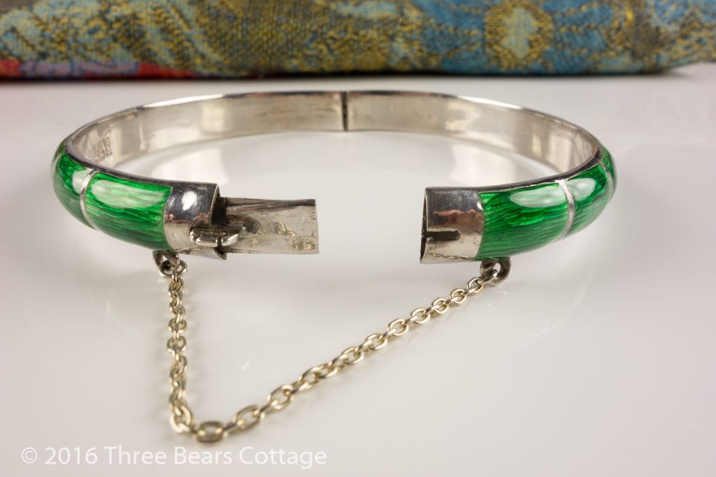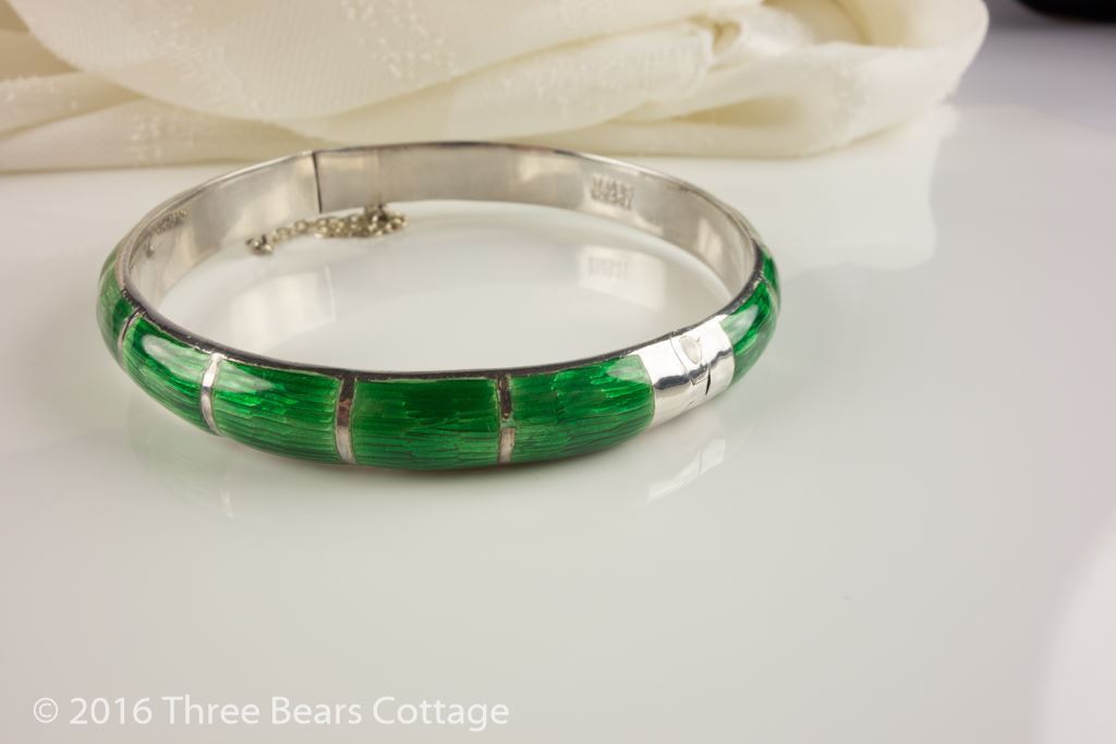 This is a beautiful hinged bangle, segmented by basse taille panels of green enamel over an engraved base.