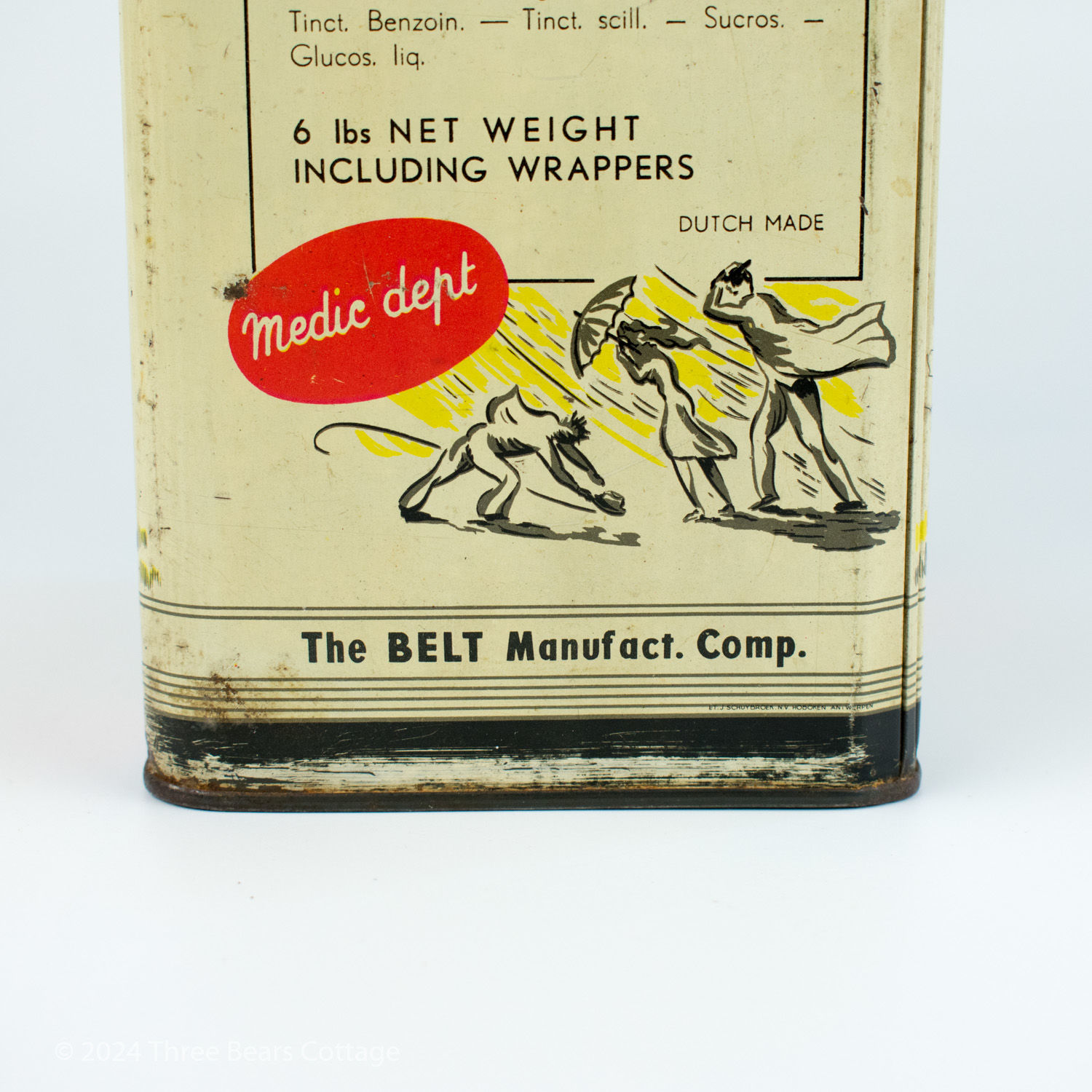 This is a rare, metal retail tin for shop stock cough sweets, manufactured for a Dutch maker, but with all text and measurements in English and so destined for export. This is possibly a sample tin, we have not been able to identify the brand or find other tins. The text states that it was made for the "BELT Manufact. Comp" with "Dutch Made" and "medic dept." in a red oval.